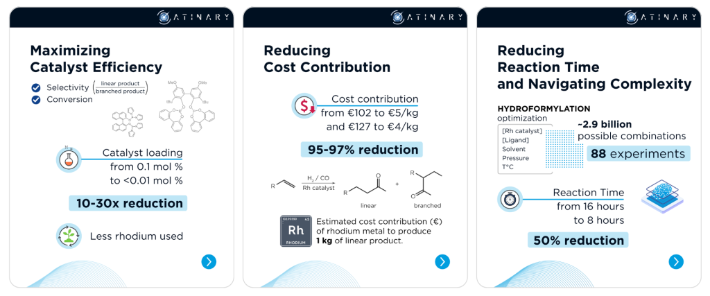Through this collaboration, the process chemists at dsm-firmenich used SDLabs and applied Atinary’s FalconGPBO algorithm and Bayesian Optimization to efficiently explore billions of possible reaction conditions, identifying optimal hydroformylation parameters in just 88 experiments.