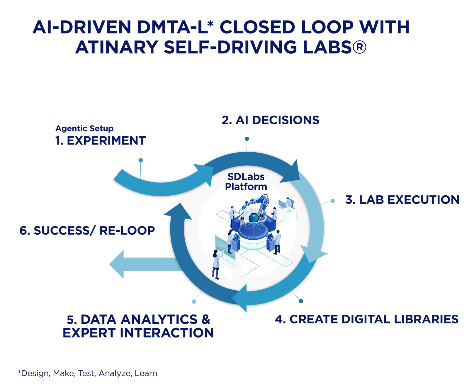 Self-Driving Labs (SDLs) automate the full Design–Make–Test–Analyze-Learn (DMTA-L) cycle by integrating AI, robotics, laboratory automation, and human expertise into a closed loop.