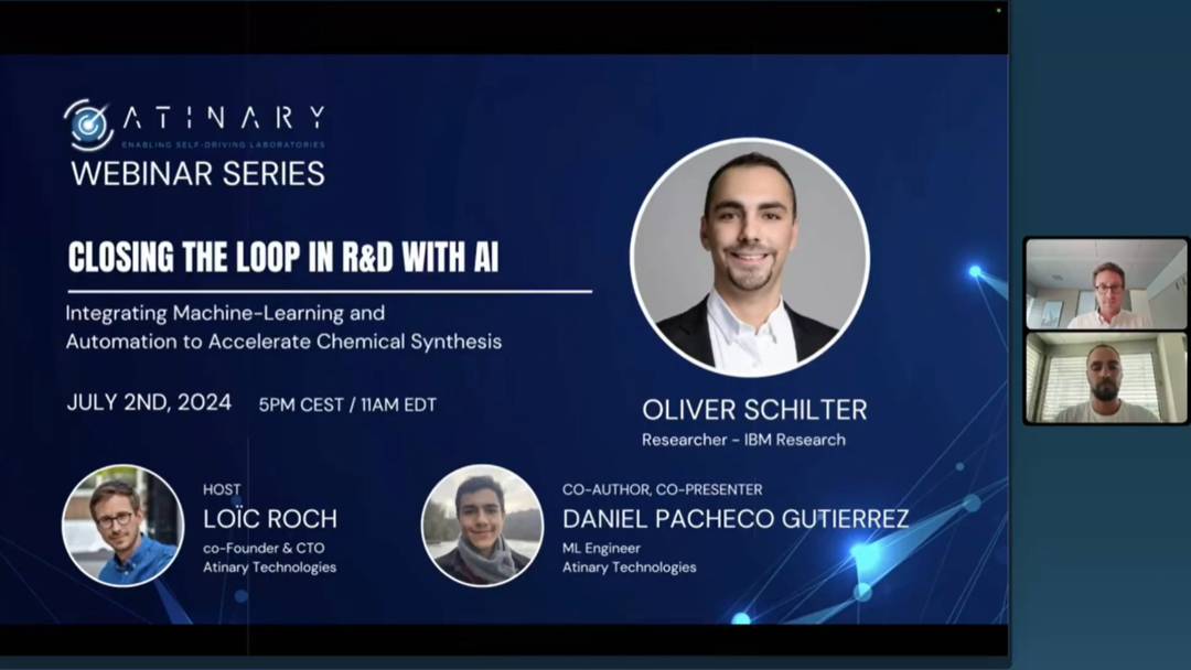 In the latest installment of Atinary’s Webinar Series, “Closing the loop in R&D with AI: Integrating Machine-Learning and Automation to Accelerate Chemical Synthesis”, our Co-Founder and CTO, Dr. Loïc Roch, hosted Oliver Schilter, researcher at IBM Research Europe, together with Daniel Pacheco, ML engineer at Atinary.